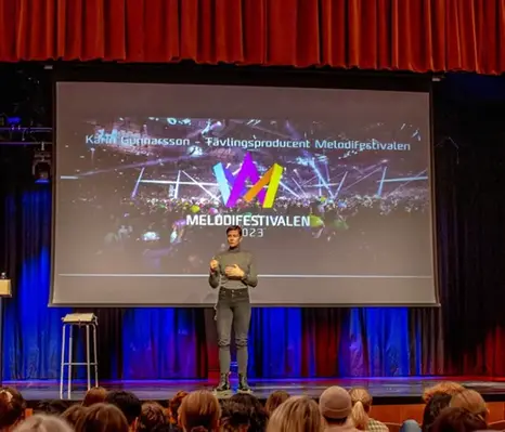 Möte med branschen. Eleverna fick ta del av föreläsningen som visade vilken stor bredd inom medieproduktion melodifestivalen faktiskt är. Arbetet bako...