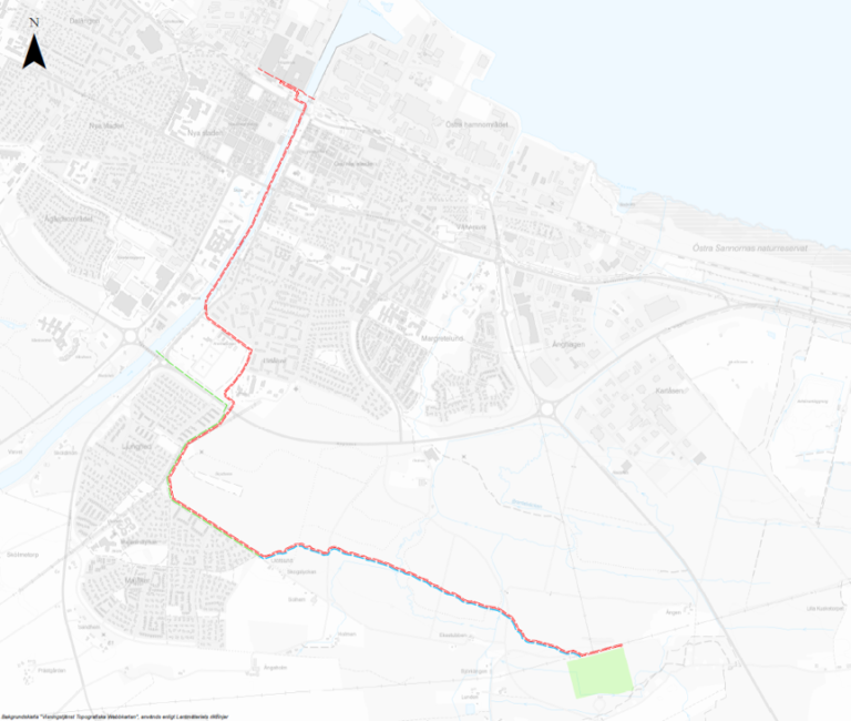 På denna bild visas förstahands yrkandet för ledningsdragningen där blå och grön linje är ängsbäcken och utloppsledningen och röd linje är ledningsdragningen till reningsverket.