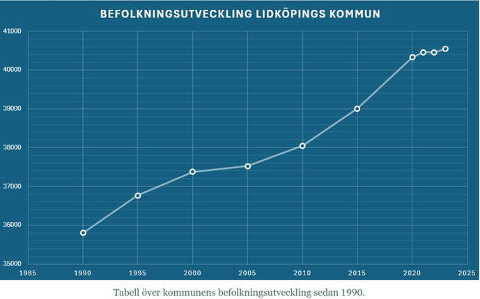 Kommunen beställer årsvis och kvartalsvis befolkningsstatistik från SCB. Statistiken visar befolkningsförändringar vad gäller födda och döda, in-, och utflytt (inom länet, riket och utlandet). Statistiken är uppdelad i femårsklasser. Den är inte uppdelad i några geografiska delområden. Vid årsskiftet 2024/2025 hade Lidköpings kommun 40 425 invånare.