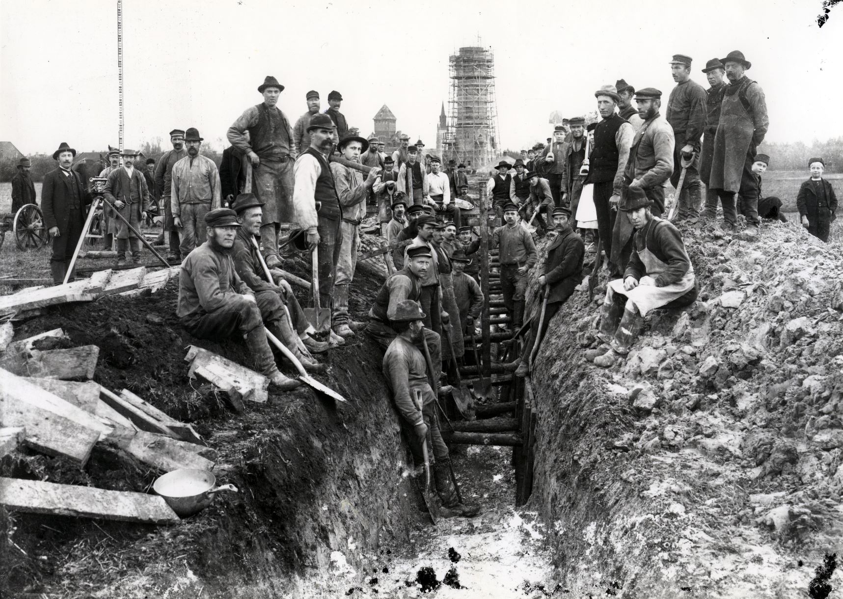 Anläggandet av vattentorn och vattenledning i början av 1900-talet krävde mångas arbetsinsats och därtill många spadar. I bakgrunden syns ett vattentorn med vattenverk under uppbyggnad samt brandstationen, nuvarande missionskyrkan. Fotograf: Werner Lindhe.