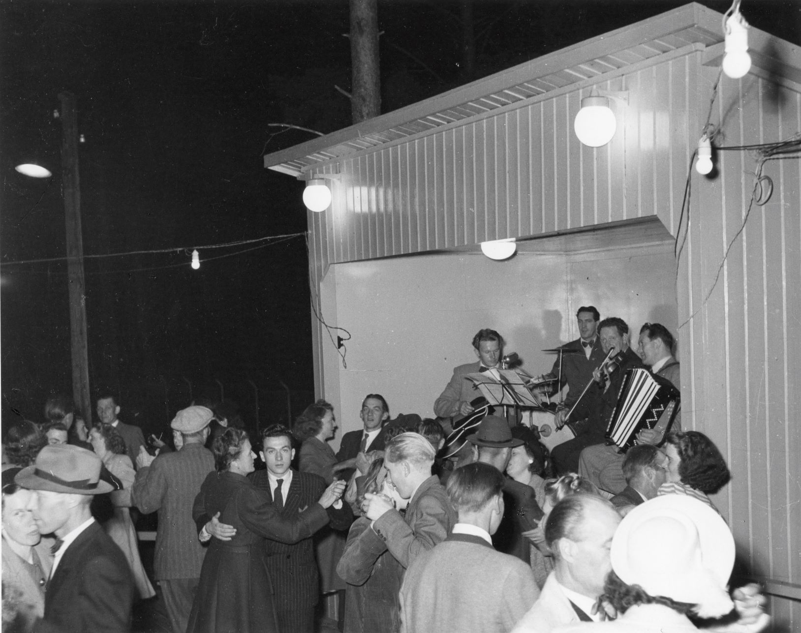 You need to watch your step while dancing at the crowded open air dance pavilions during the mid-20th century. Common dance styles could include schottische, mazurka and hambo. These kinds of partner dances became increasingly popular in Sweden during the 20th century, and could sometimes replace the roles that contra dance and circle dance used to play. Unkown photographer. The photo belongs to Skaraborgs Föreningsarkiv.