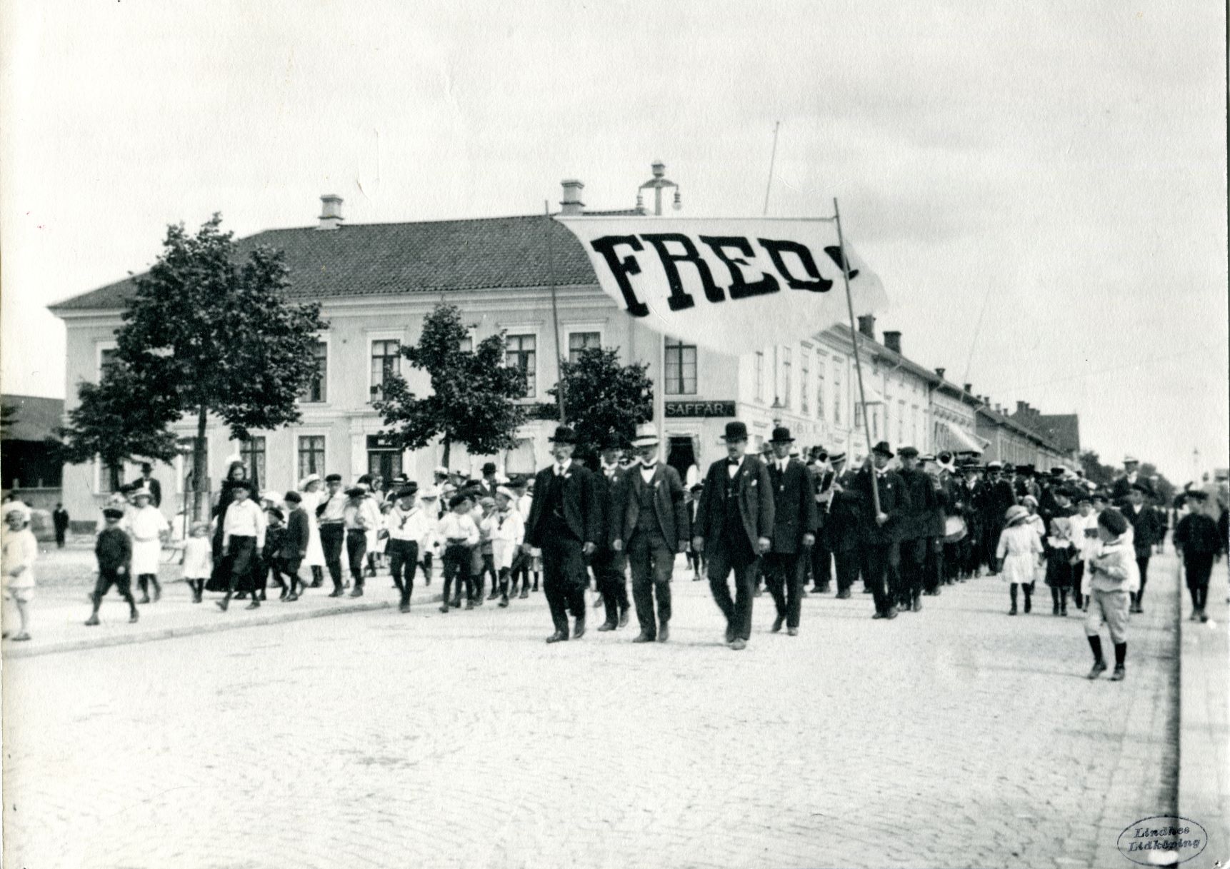 Under orostider finns även hopp om frid. Denna demonstration för fred vid Gamla stadens torg är ett exempel på det. När bilden tas rasar första världskriget ute i Europa. Fotograf: Werner Lindhe. Fotografiet tillhör Skaraborgs Föreningsarkiv.
