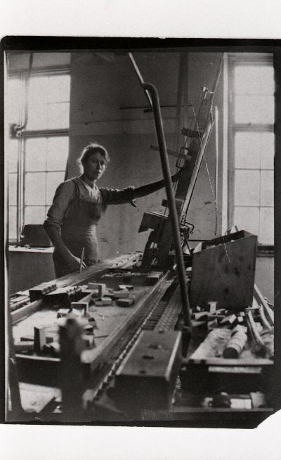 Tändsticksarbetaren Aina Johansson vid en paketeringsmaskin på tändsticksfabriken Sirius, omkring år 1918. Att arbeta vid denna maskin var riskfyllt och många fick brännskador när tändstickorna exploderade. Det var vanligt att tändsticksarbetare levde i bostäder som ägdes av tändsticksfabriken. Aina bodde däremot i ett hus som ägdes av hennes familj, i närheten av fabriken. Vänermuseet har flera foton på Aina när hon umgås med vänner och familj på fritiden. Okänd fotograf.