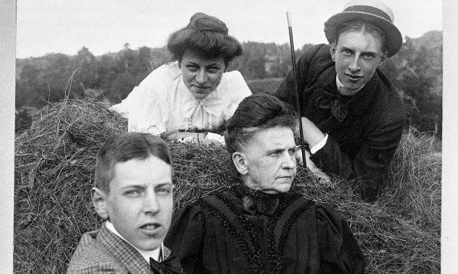 I en höstack har vi här Gösta Falkengren med hatt. Längst fram i bild ser vi brodern och fotografen Uno Falkengren. I mörka kläder syns brödernas faster Ottonie Falkengren. Kvinnan i vit klänning är inte namngiven. Bilden är tagen under 1900-talets början. Du kan lära känna Uno bättre i Vänermuseets utställning Berättelser från Lidköping.