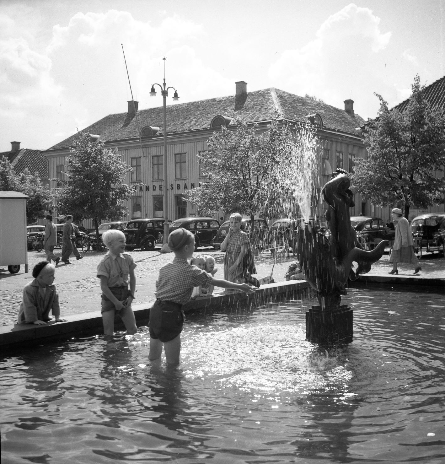 Det är en varm lördag när Gunnar Hoflund beger sig till Nya stadens torg. Han knäpper en serie bilder och fångar vardagen under mitten av 1900-talet. Några bilar och många cyklar står prydligt uppställda runt torget. I fokus på alla bilder är däremot barnen som svalkar sig och leker i fontänen. Här ser du en bild, resten finns i Vänermuseets samlingar.